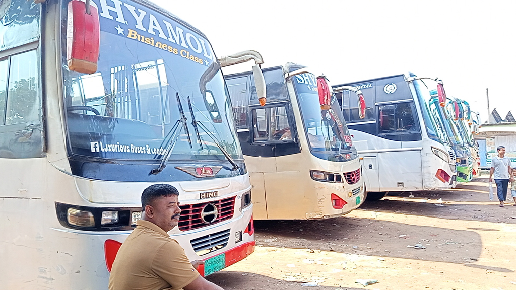 আজ বৃহস্পতিবার (১৩ নভেম্বর) সকালে নেছারাবাদ বাস টার্মিনাল ঘুরে দেখা যায়, সারিবদ্ধভাবে দাঁড়িয়ে আছে বিভিন্ন পরিবহনের গাড়িগুলো, আর চালক ও হেলপাররা অলস সময় কাটাচ্ছেন।