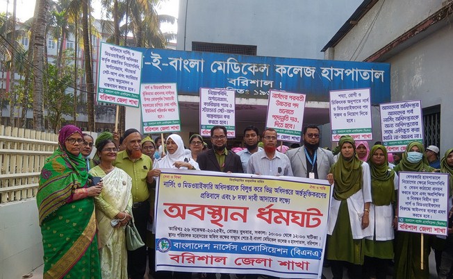 ৮ দাবিতে বরিশালে নার্সদের অবস্থান ধর্মঘট