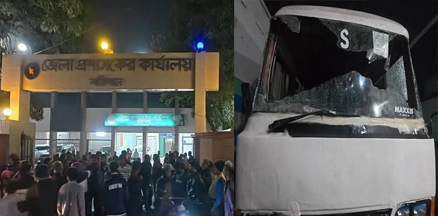বরিশালে ক্ষতিপূরণ না পেয়ে দুটি স্টাফ বাস ভাঙচুর, ডিসি কার্যালয়ে বিক্ষোভ