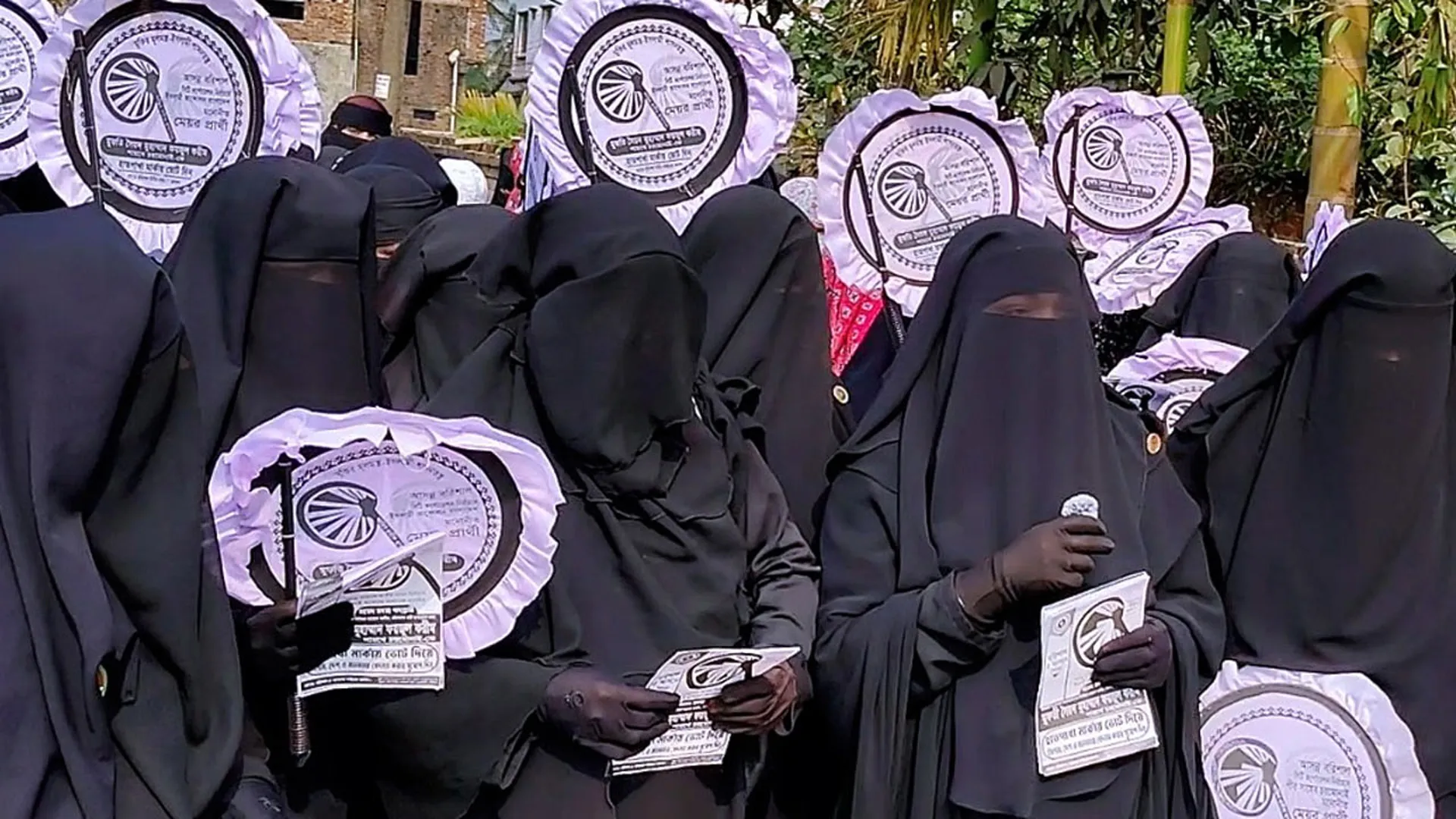 বরিশাল-৫ আসনে হাতপাখার পক্ষে প্রচারণায় মাঠে নারী কর্মীরা