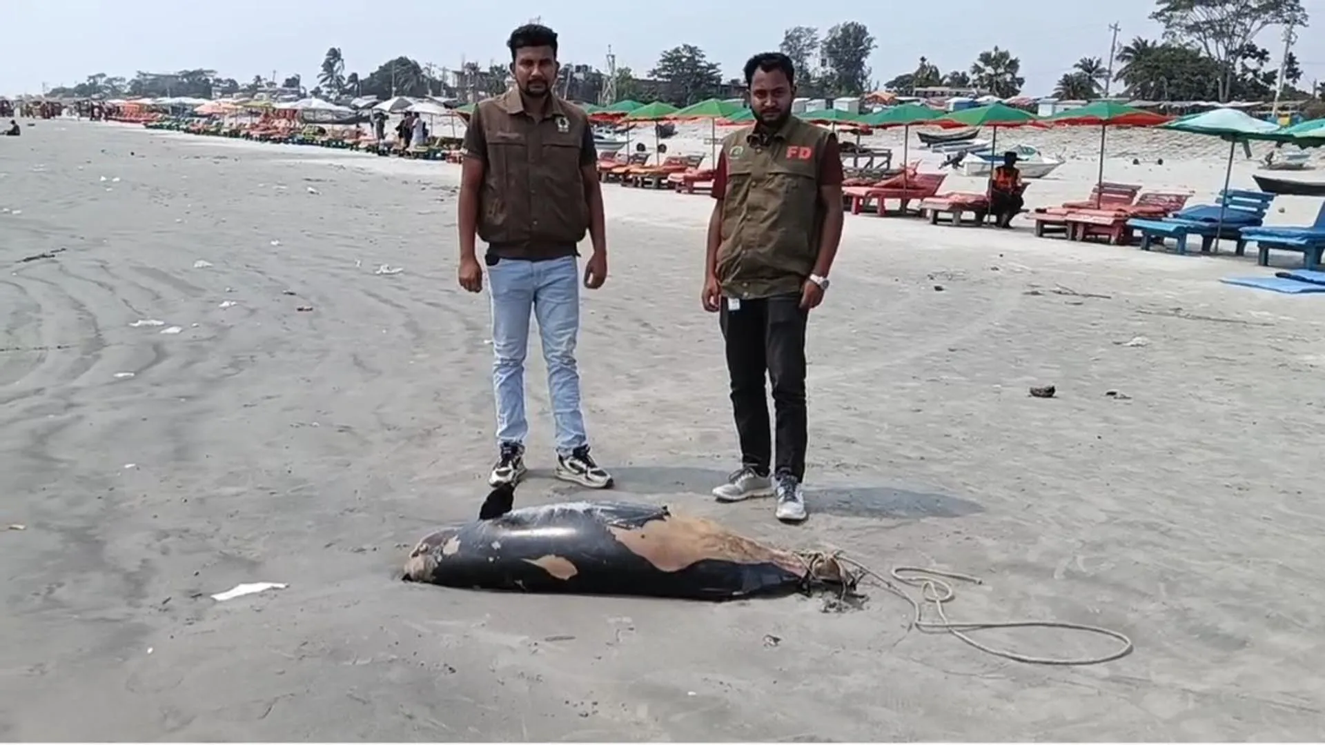 কুয়াকাটা সমুদ্র সৈকতে ফের ভেসে এলো ৮ ফুট লম্বা মৃত ডলফিন